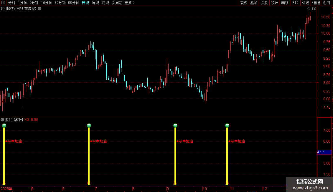 指标基于MACD系统,主要识别处于多头趋势中的“空中加油”买入信号。当快慢均线均在零轴上方(表明市场处于多头状态),且MACD红柱在经历一轮缩量回调后重新放大,视为上涨动能再度增强的信号,此时触发提示。操作上,投资者可在信号出现时考虑顺势加仓或介入,以捕捉趋势延续带来的收益。整体策略强调顺势而为、聚焦强势行情中的二次启动点。