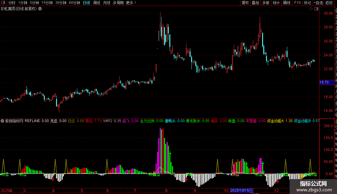 红箭头:=IF(资金动能B<控盘,资金动能B,控盘);