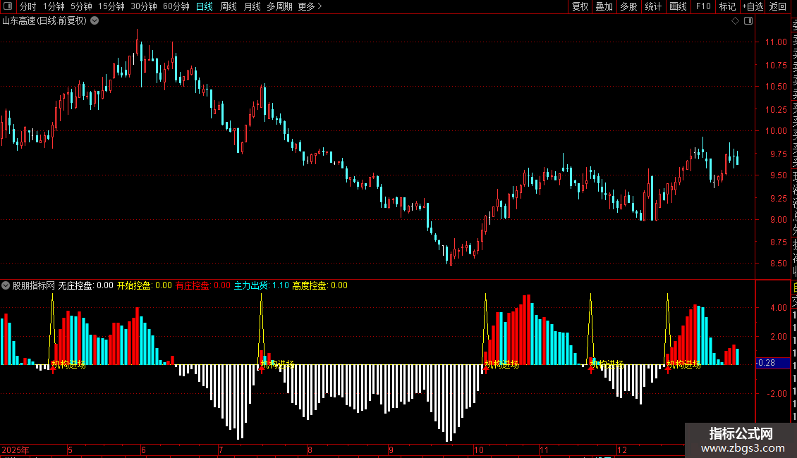 形态:股价不断创新高,副图出现黄色的“高控盘”信号,且数值持续在50以上。