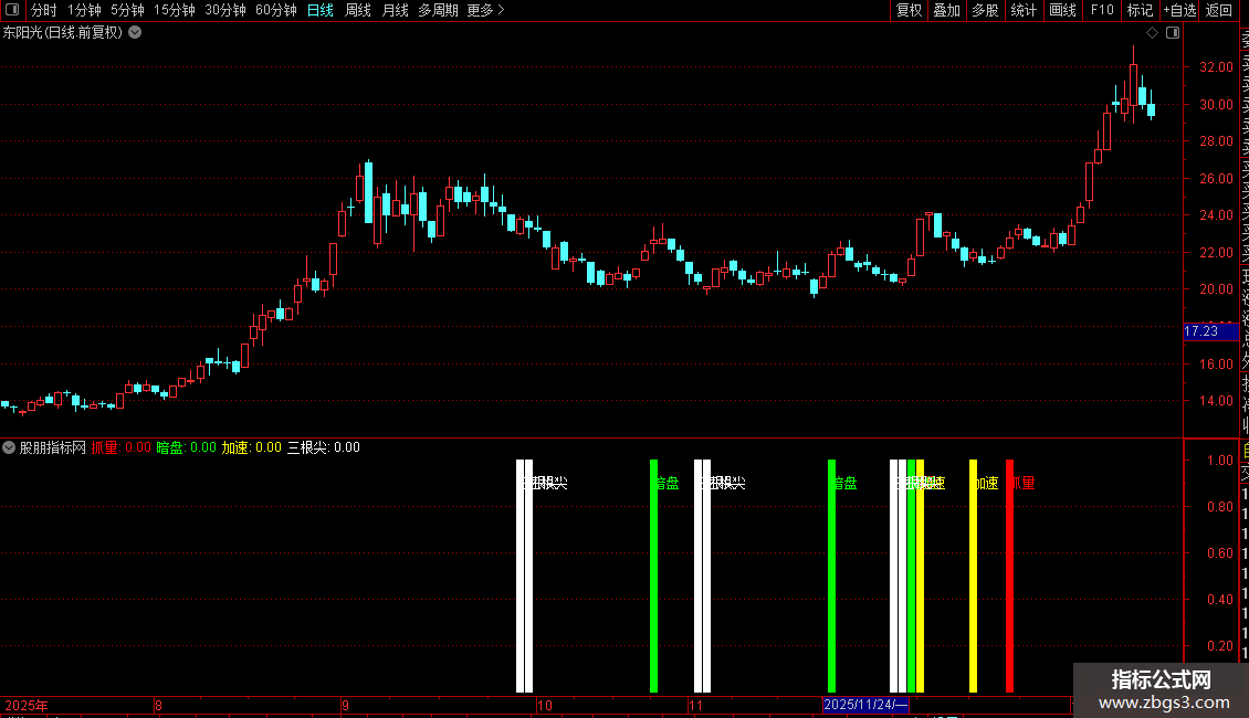 指标通过价格与成交量的关系,结合均线系统,识别股票的短期交易机会。"抓量"关注于股价突破短期均线且成交量显著放大时的机会;"暗盘"则捕捉股价在接近中期均线前的短暂调整阶段;"加速"强调股价有效突破长期均线并保持上升趋势的强势信号;而"三根尖"用于发现股价触底反弹的早期迹象。操作策略建议依据不同信号的特点进行灵活配置,比如利用"抓量"和"加速"追求快速上涨的机会,用"暗盘"和"三根尖"寻找反转或调整结束的入场点。