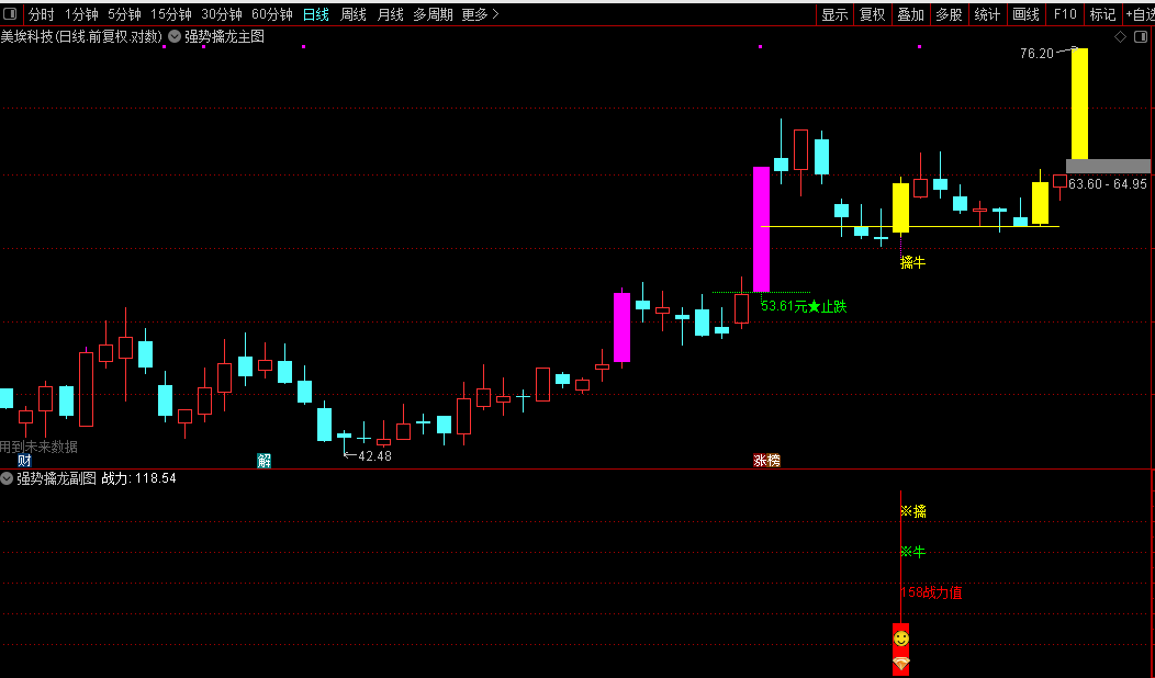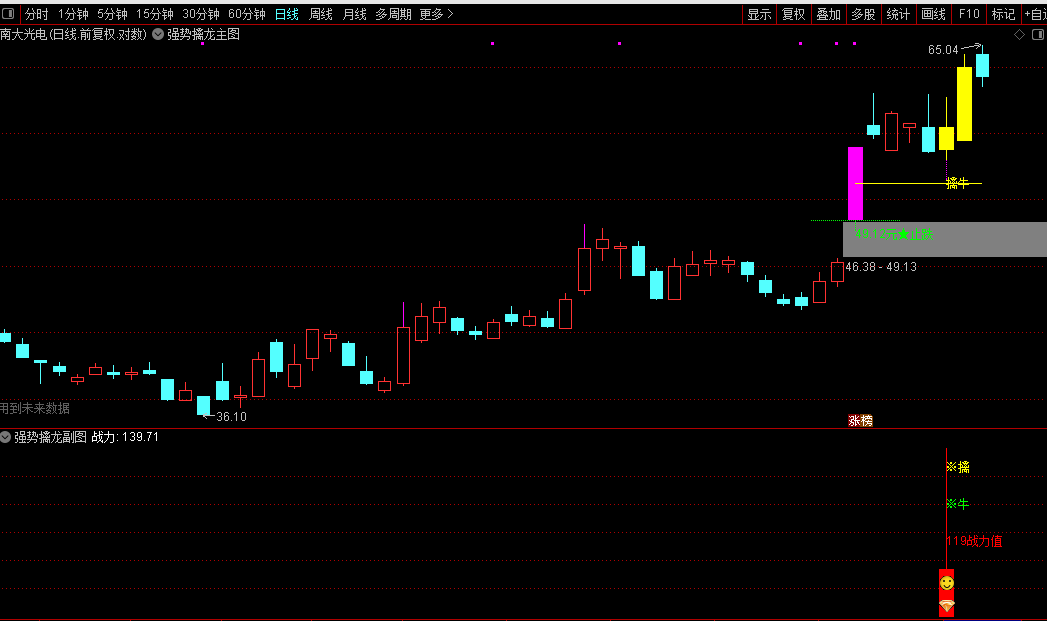 4、主图中黄色柱子上的“成龙”信号,标志着该股票即将突破,是买入的绝佳时机。这一信号预示着股票将迎来上涨趋势,体现了投资中的至简之道。