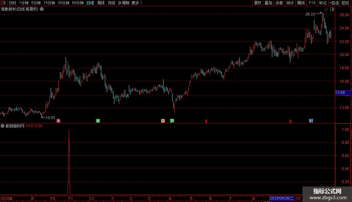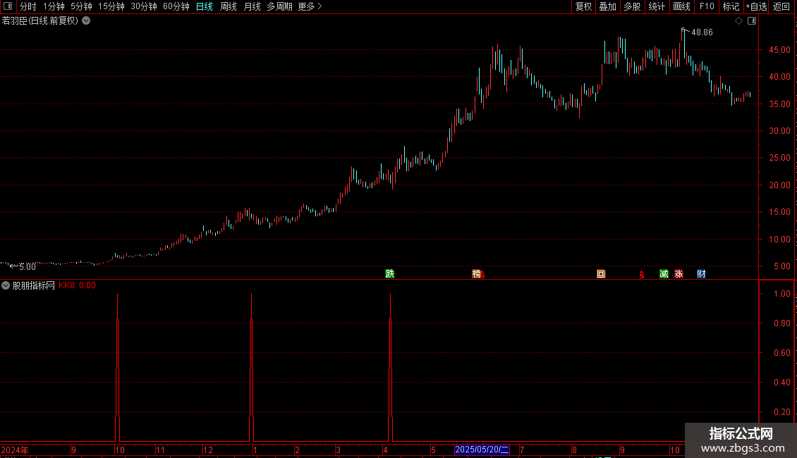 KK8:C<REF(C,1)*0.907 AND MA5>=REF(MA5,1) AND MA1>MA2 AND (H<REF(O,1) OR H<=REF(C,1)),COLORRED;