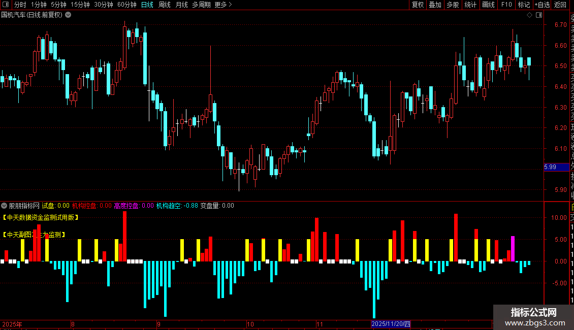 指标主要用于监测主力资金对个股的控盘状态和操作动向。通过双重平滑价格计算出“控盘”力度,结合筹码分布与成本数据,识别主力是否在吸筹、高度控盘、试盘或开始出货。当控盘由负转正时视为试盘信号;持续上升且处于正值区域,代表机构积极介入;若控盘虽为正但开始回落,则提示可能在派发筹码;而控盘为负则反映主力离场或做空意愿。此外,还通过筹码集中度辅助判断控盘强度,并标出变盘过渡期。