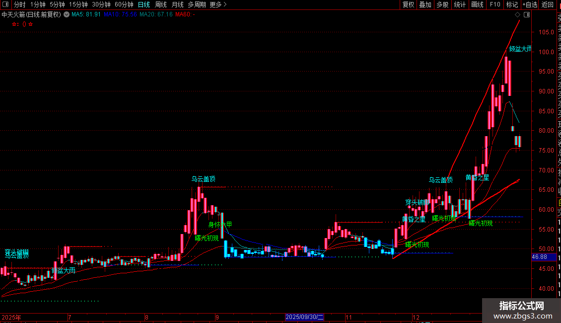 建议结合使用:当价格运行于55日均线上方(蓝色区域)时,主要关注多头形态(如“曙光初现”、“锤头”)带来的买入或持有机会;当价格运行于55日均线下方(橙色区域)时,则重点防范空头形态(如“黄昏之星”、“乌云盖顶”)发出的风险信号。形态信号与趋势轨道、强弱区域产生共振时,其指示意义更为重要。本公式旨在提供多维信息,具体决策需结合成交量、市场环境等其他因素综合研判。