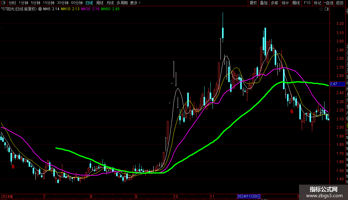 1 分析股票走势时,通过不同均线把握周期趋势:绿色线指示长线趋势,紫色线体现中线趋势,5日和10日均线反映短期波动。