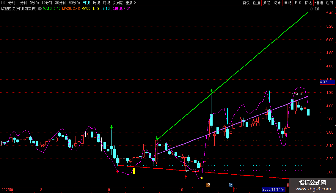 中轨:DRAWLINE(CURRBARSCOUNT=STARDAY,ZGSTAR,ISLASTBAR,ZGEND,1),COLORFF55BB,LINETHICK2;