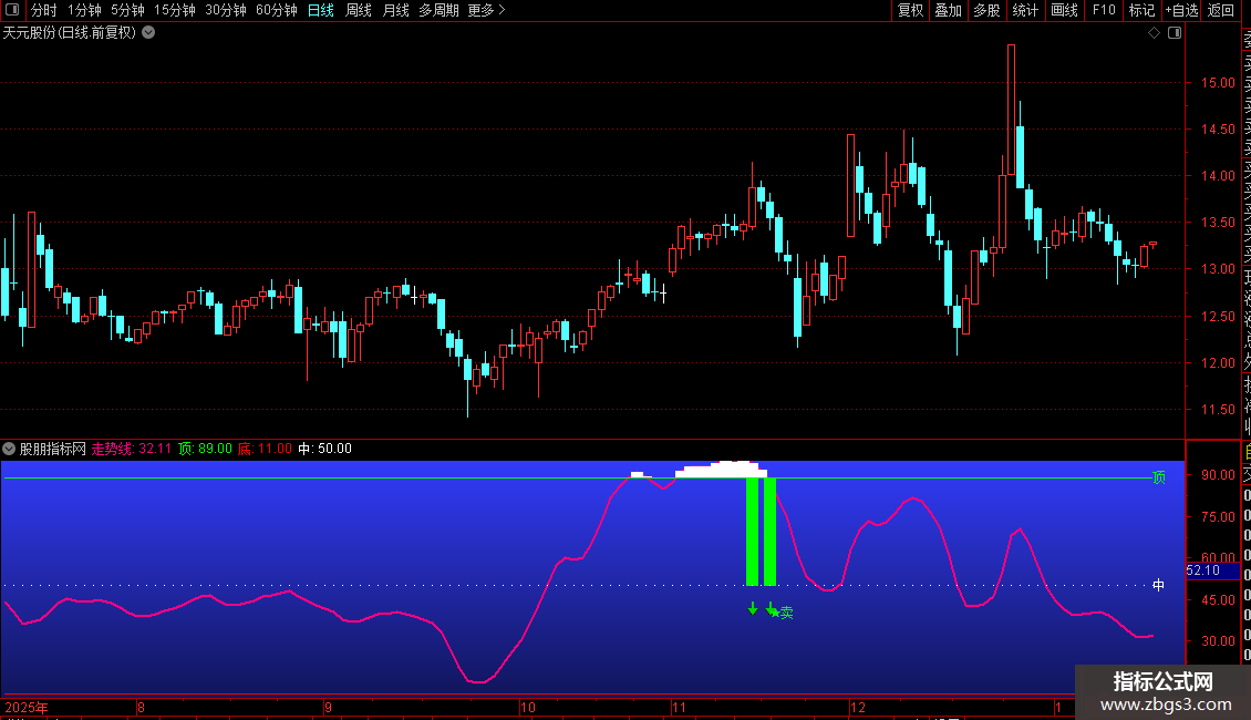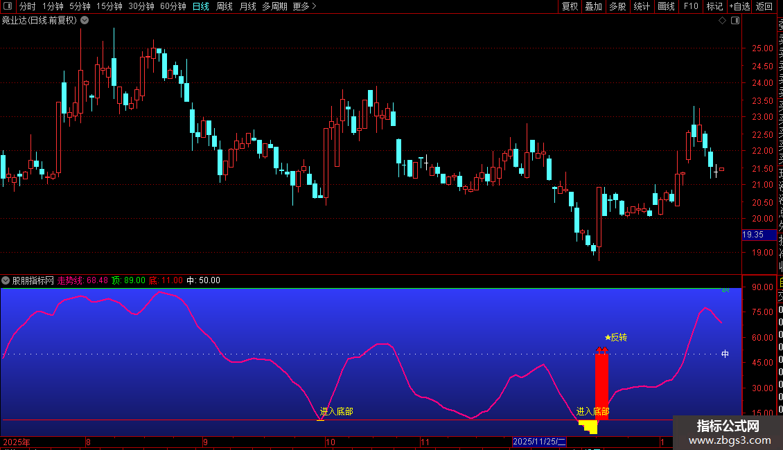 指标主要用于判断股价是否处于极端超买或超卖区域,并结合价格与动态区间中轴的位置关系,提示潜在的反转买卖点。当指标值处于低位并向上突破关键阈值、且价格位于中线以下时,视为底部反弹信号,可考虑买入;反之,当指标值处于高位并向下穿越阈值、且价格在中线之上时,视为顶部回落信号,适合卖出。整体策略强调“低吸高抛”,适用于震荡或趋势初期的波段操作。