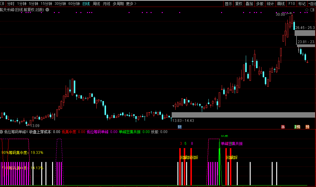 低位筹码单峰副图,副图出现紫色柱密集的地方就可以关注了,低位集中度少于12%后越少越好,阳线 启动向上突破企稳后会现一波行情。