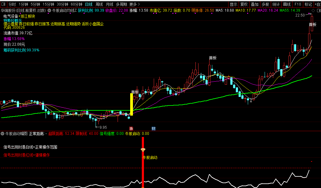 副图部分则专门用于监控股价与关键中期均线的距离。它以一根柱线实时显示当前股价偏离该均线的百分比,并用白色和红色进行区分:白色表示处于正常波动范围内,红色则提示偏离过大,需谨慎操作。当主图出现启动信号时,若副图指标线为白色,表明股价处于健康的技术位置,可视为正常操作参考;若为红色,则提示即使出现信号也需保持警惕。