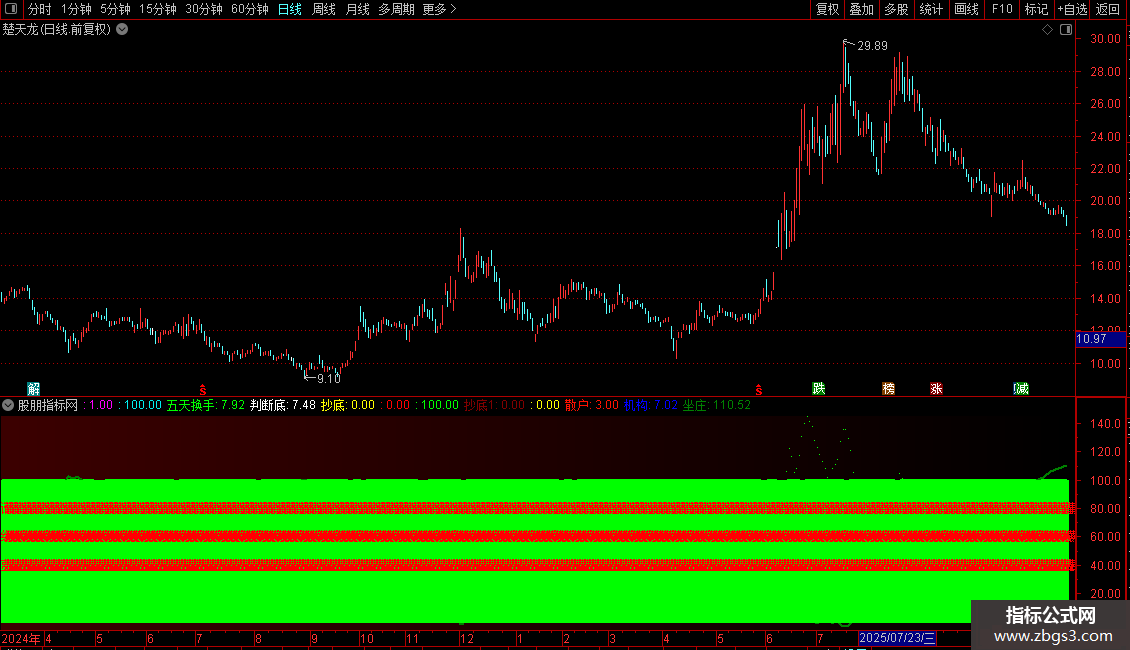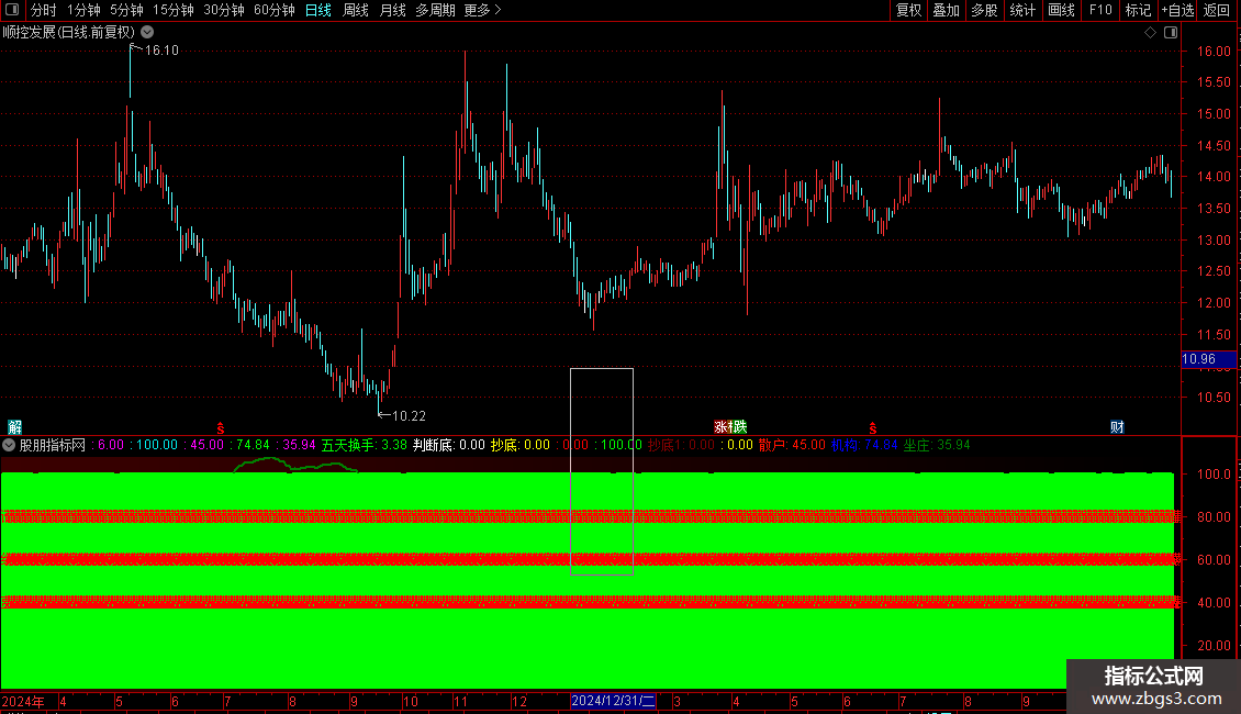 IF((操盘线2<REF(操盘线2,1)) AND (REF(操盘线2,1)>REF(操盘线2,2)) AND (操盘线2>77),88,100),LINETHICK2,COLOR00FF00;