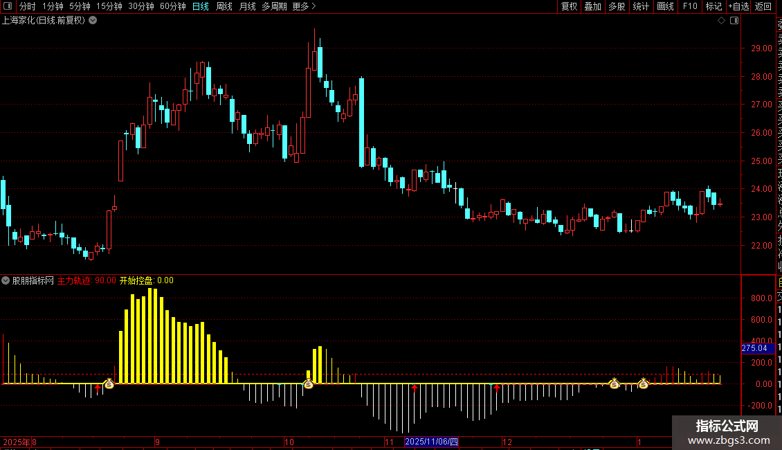2.副图中0轴以下的白色细柱体显示,代表主力控盘系数为负,暂无明显主力资金介入,0轴以上的红色细柱出现,表示控盘系数为正且持续走高,主力资金正在加仓控盘,0轴以上的黄色柱体出现,结合筹码指标既提示筹码高控盘状态,也提示控盘系数回落的主力出货风险。