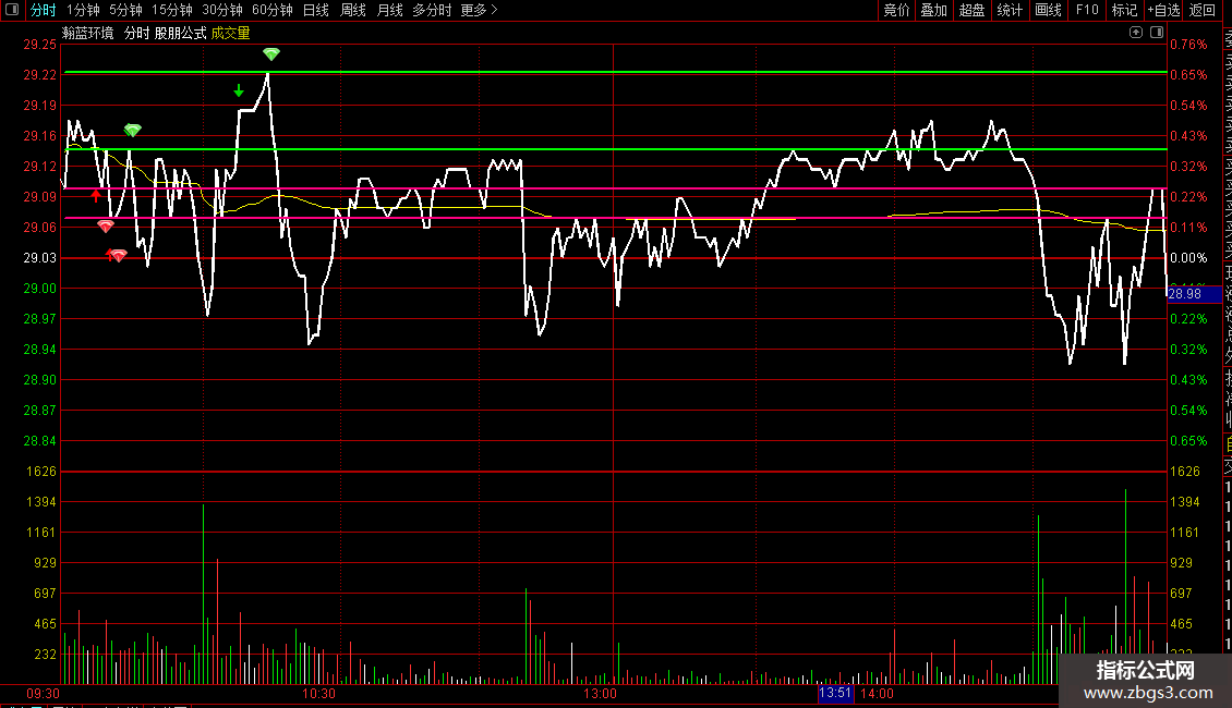 在分时主图中,红色向上箭头代表潜在的低吸机会临近,提示投资者可关注买入时机;绿色向下箭头则表示高抛机会出现,适合考虑止盈或减仓。当出现红色钻石信号时,视为明确的入场信号;而绿色钻石则作为出场信号,提示及时离场锁定收益。