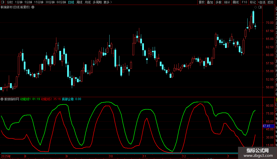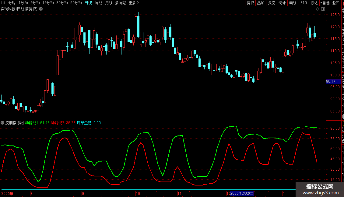 1. 动能线1(绿线)向上穿越动能线2(蓝线),代表多头动能增强,是趋势转强信号;反之则空头占优。