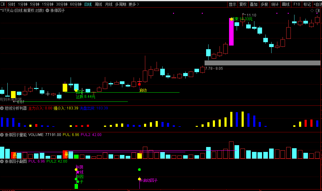 指标含2主3副4个选股器。设计思路:以涨停的思路 新视觉 实战中验证过的新思路 以确认基因黄色柱 再次捕捉尾盘阴线 涨停因子发出信号 预测个股短周期中拉出大阳 或涨停,黄色柱基因不死 后面大概率必然会拉出一根大阳 或 涨停的上攻启动因子本指标运用介绍