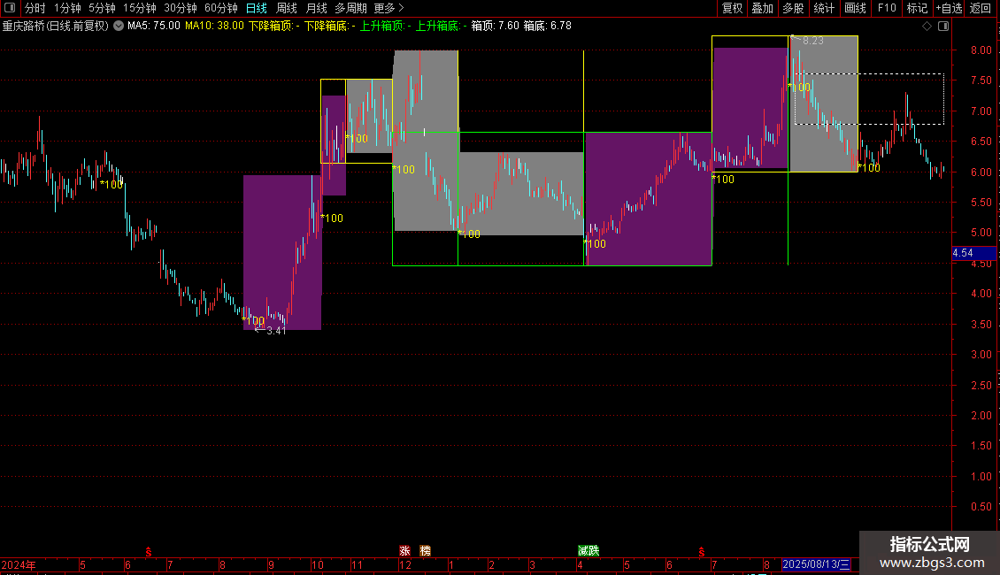 上升箱顶:IF(T2>=0 AND T2<=REF(BARSNEXT(XIA),T2),REFX(红止高,BARSNEXT(XIA)),DRAWNULL),COLORGREEN;