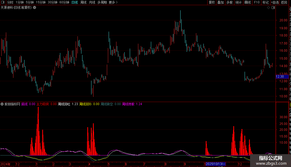 2. 辅助判断:“周线回补”(黄色)出现时,代表短期回调到位,可强化抄底信号;“周线持股”(洋红色)持续在线,说明底部企稳,持股性价比高;