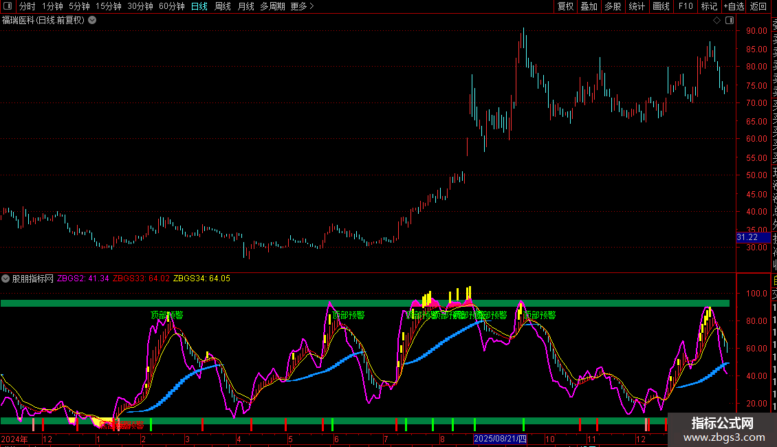 2. 顶部风险:出现“顶部预警”绿色文字,或ZBGS50下穿84时,提示顶部区间,建议逢高止盈;