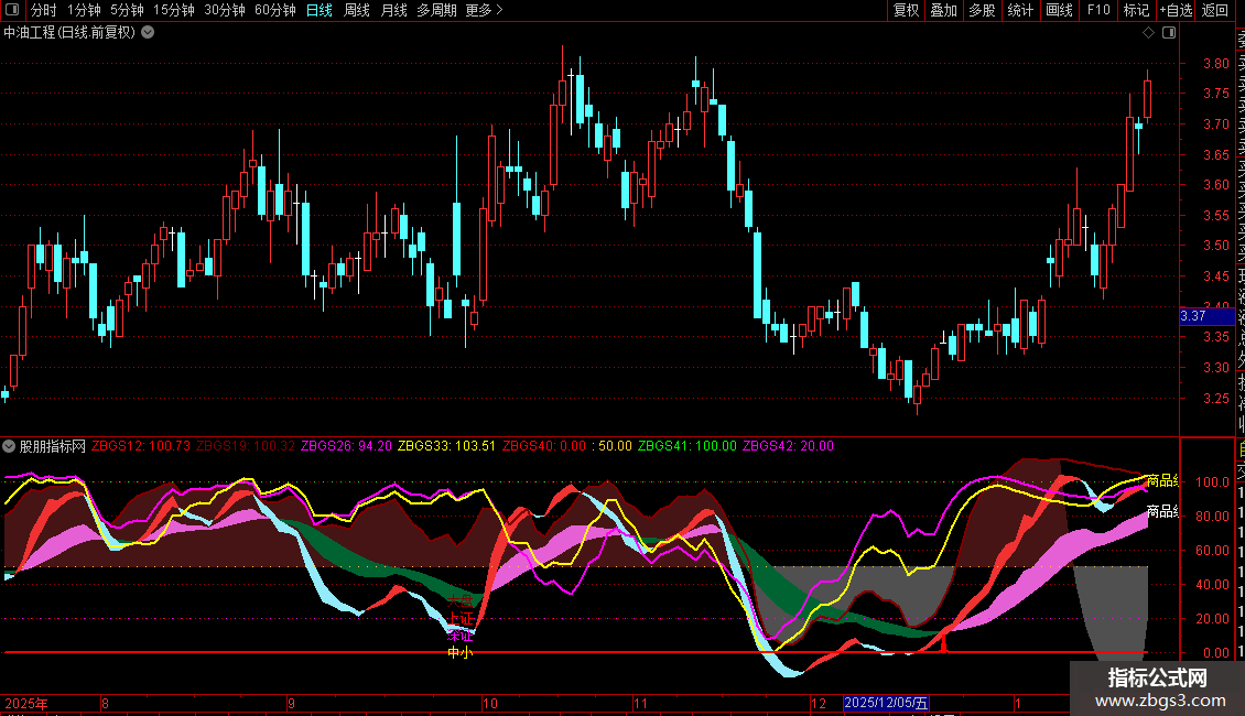 该副图公式核心围绕27周期强弱计算,同步监测个股、上证、深证、沪深300、中小板等多维度价格强弱,通过SMA平滑处理生成多组强弱线,搭配色彩带宽直观展示不同维度强弱背离。公式内置20/50/100关键数值标线,当个股强弱线低位金叉且数值<30时,会触发红色立柱买入信号,多维度共振验证个股相对市场的强弱拐点。