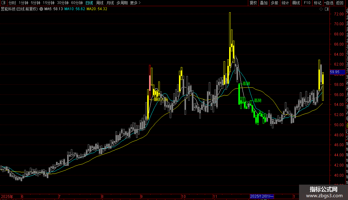 X_EA:=MA(HIGH,20)*0.8,COLORGREEN,LINETHICK1;