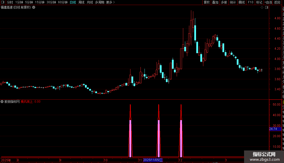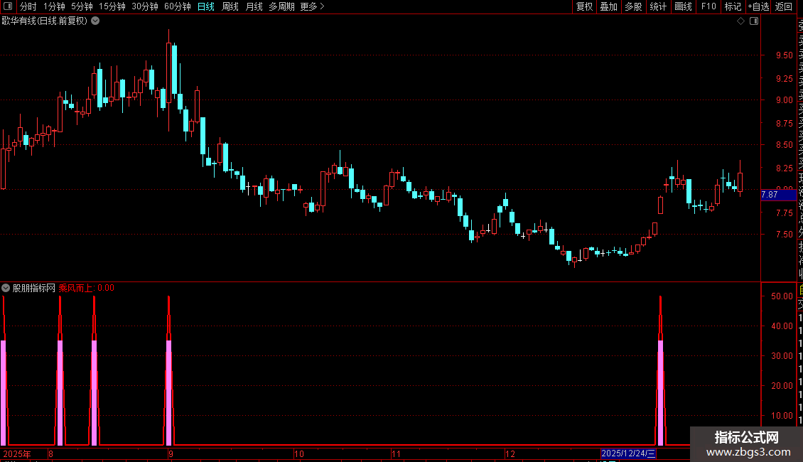 1. 指标副图中出现蓝色柱状(数值50)、粉色柱体叠加黄色“★乘风而上”图标时,为明确买入信号,代表个股符合上升趋势且短线启动条件;