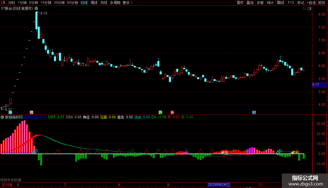 质:IF(LLV(DX,2)=LLV(DX,7) AND COUNT(DX<0,2)>0 AND CROSS(DX,MA(DX,2)),5,0),COLORRED;