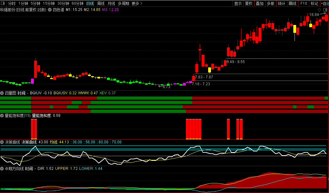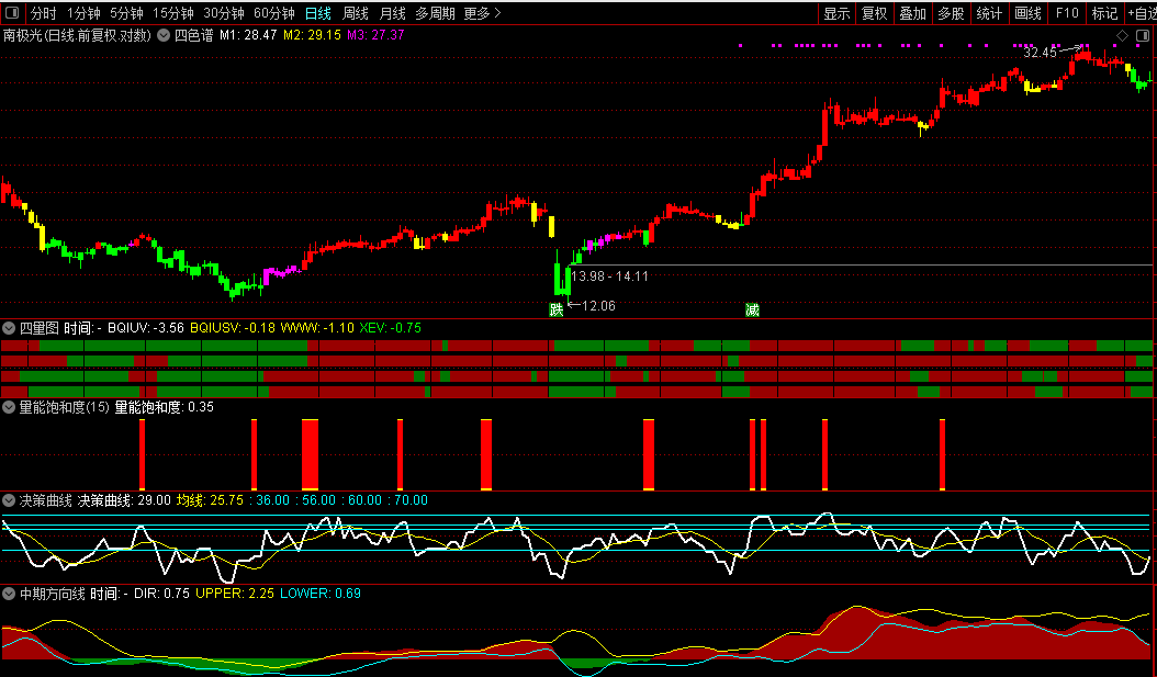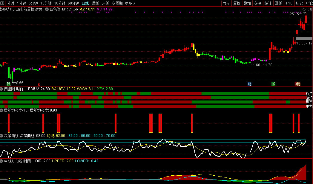 通达信【麟龙四色谱】主图+四量图中期方向线量能饱和度副图/选股指标源码