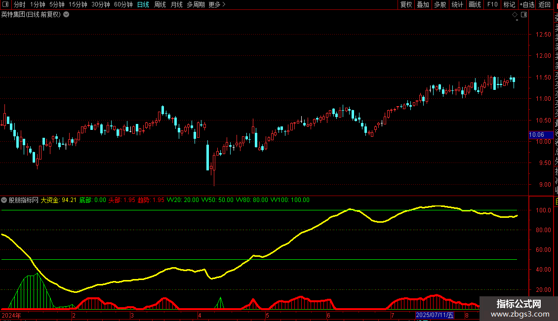 指标主要通过价格在一定周期内的相对位置,结合成交量加权均价的差异,来判断市场所处的高低位置及主力资金动向。当指标显示“底部”信号时,意味着价格处于阶段性低位,可能存在反弹机会;“头部”和“趋势”部分则反映资金流出或高位压力,提示潜在回调风险;“大资金”线用于观察主力活跃程度,数值变化可辅助判断市场强弱。整体策略偏向于低吸高抛,适合震荡市中捕捉波段机会。