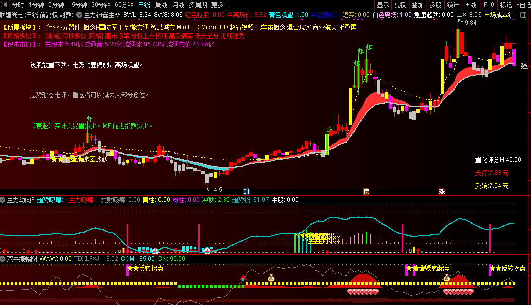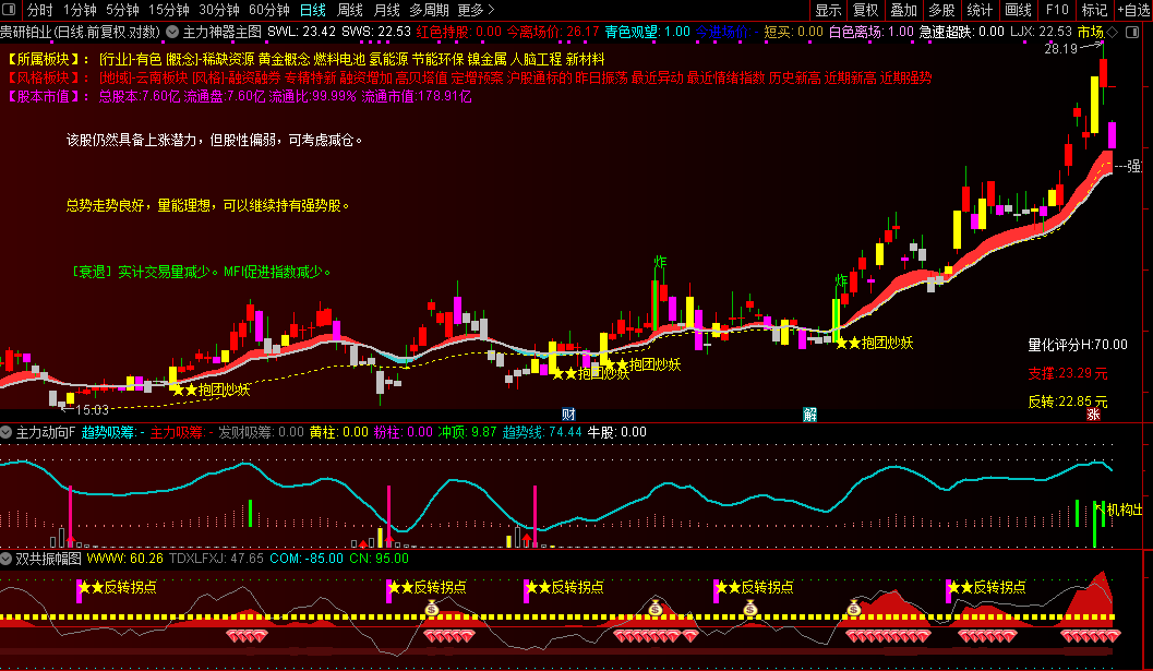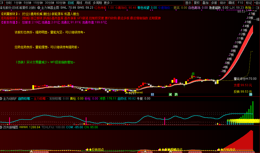 - 主图公式实时展示所属板块、股本结构、业绩指标,并通过“红色持股/青色观望”信号明确多空状态,叠加“抱团炒妖”“连板识别”“强支撑位”及“量化评分H”,一眼锁定强势标的;