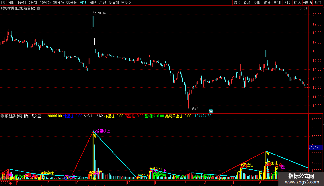 预估成交量:IF((CURRBARSCOUNT=1 AND DYNAINFO(8)>1),VOL*(TOTAL+3)/(CTIME+3),DRAWNULL),NODRAW;