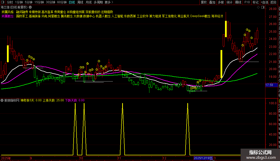 神奇涨5天:IF(X_35 AND X_40 AND X_41 AND X_42 AND X_43 AND X_46,100,0),COLORYELLOW,LINETHICK2;