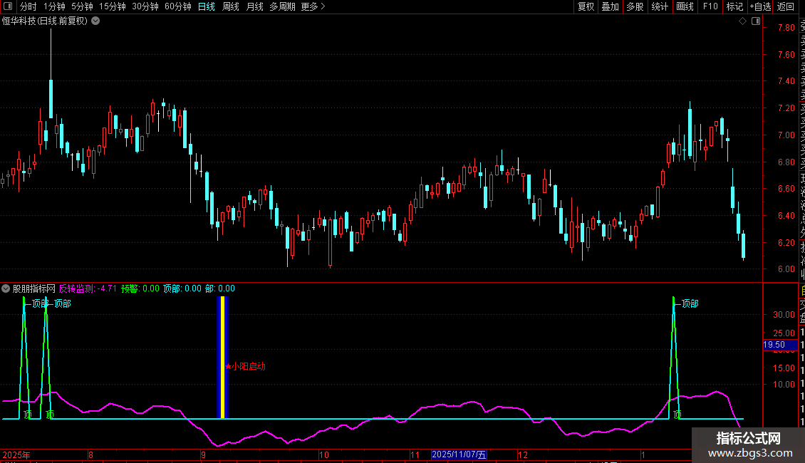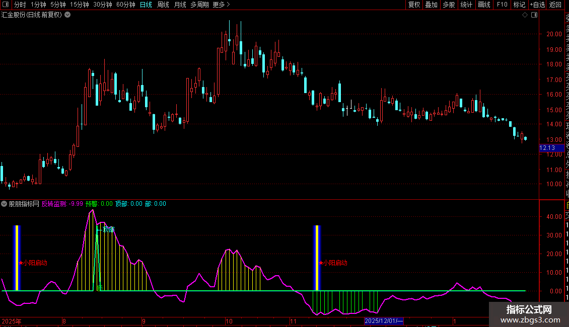 小阳启动指标中反转监测线为白色曲线,是核心趋势的判断依据,计算基于收盘价及股价平均水平,反映股价相对于中期趋势的偏离程度,当指标出现小阳启动信号时,表示底部企稳,小阳反转趋势出现。