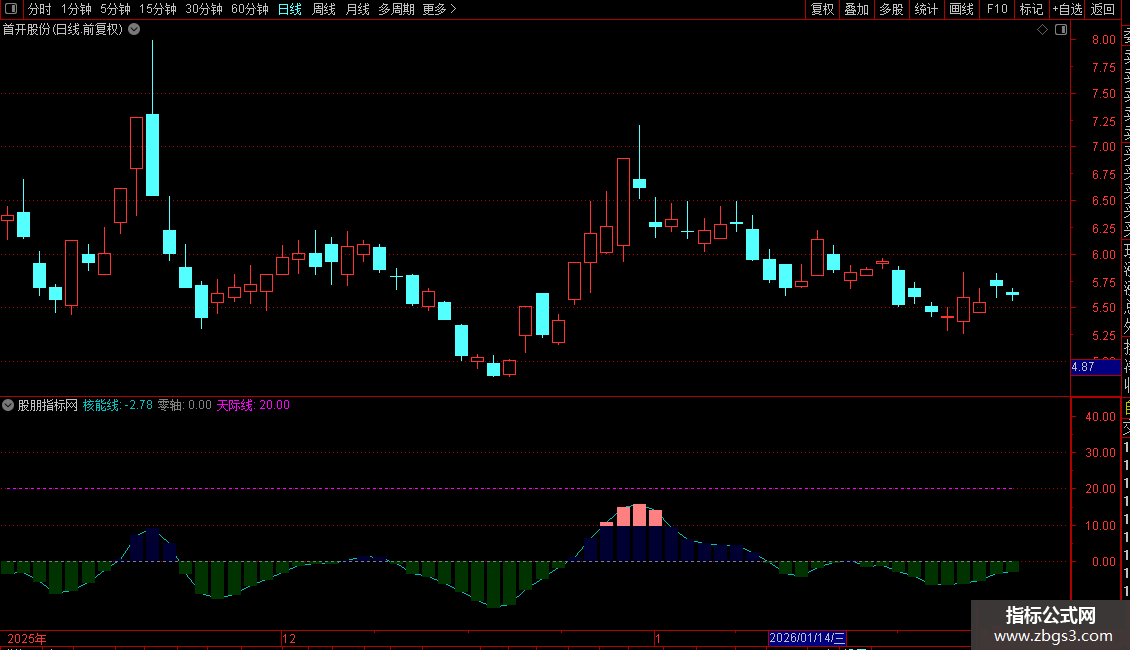 该指标结合价格偏离均线的程度与随机指标KDJ的平滑值,构建出核能线和量化资金两条核心曲线,用于判断股票趋势强弱与资金动向。当趋势向上、资金线上穿核能线且成交量明显放大时,触发暴力加仓信号,提示强势介入机会;当核能线从低位上穿负15时,提示潜伏布局信号;若核能线高位下穿资金线,则发出减磅警戒信号。整体策略侧重于趋势确认、量能配合与高低位反转信号,是一款实用的股票指标公式。