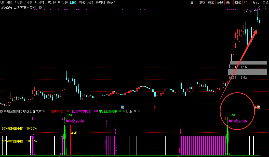 通达信【单峰密集共振】副图/选股单峰密集共振和涨停回踩妖股源码