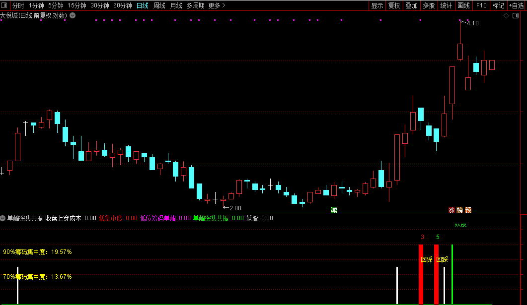 副图指标中,同时出现“单峰密集共振”和“妖股”信号的时候,往往是转折点,选股指标选出来这个位置的信号,指标用到了筹码和获利盘的函数,对于启动点把握不错,单峰密集区是紫色柱子,要结合股价的位置,低位最好。筹码类型公式用得到cost和winner函数不喜勿下!