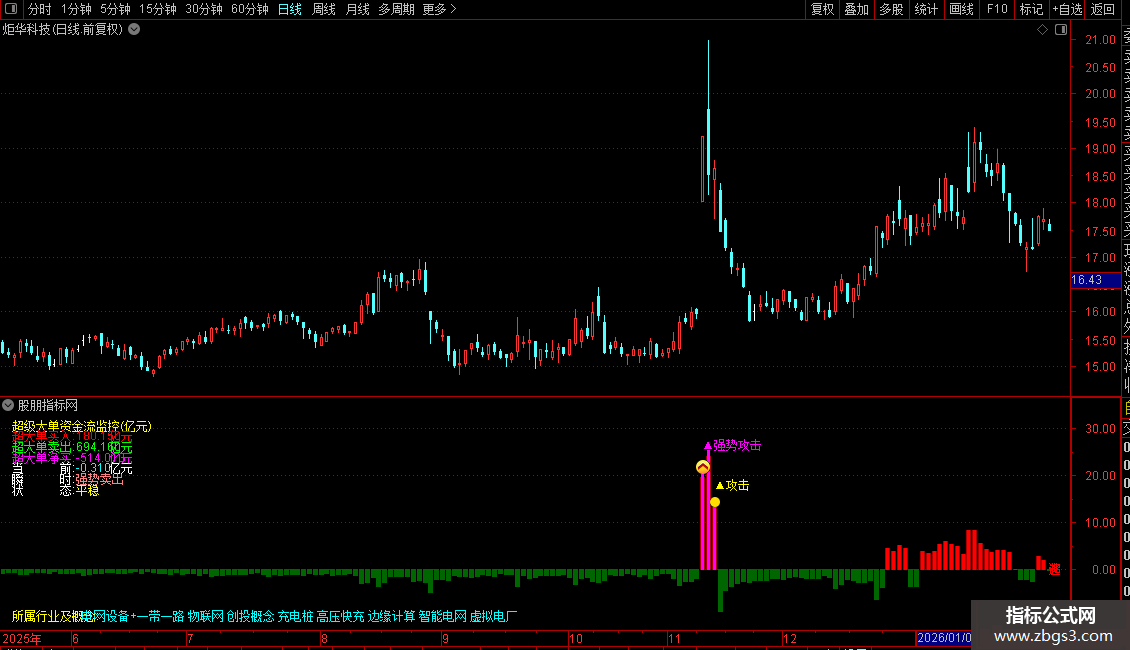 指标主要用于实时监控市场中超级大单资金的流向与活跃程度,通过识别大额成交是否伴随价格上涨,判断主力资金是积极进场还是出逃。它不仅统计累计净流入/流出金额,还结合近期量能基准,评估当前资金动作是否异常,并据此划分攻击强度和资金状态。图表上用不同颜色柱体直观显示买卖力度,同时标注“强势攻击”“连续流入”等关键信号,辅助判断短期多空动能。