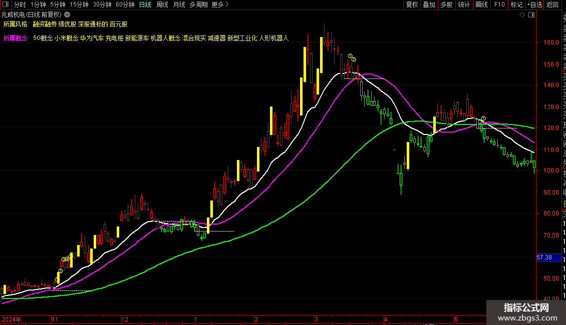 中线成本:EMA(X,13),LINETHICK2,COLORFF00FF;