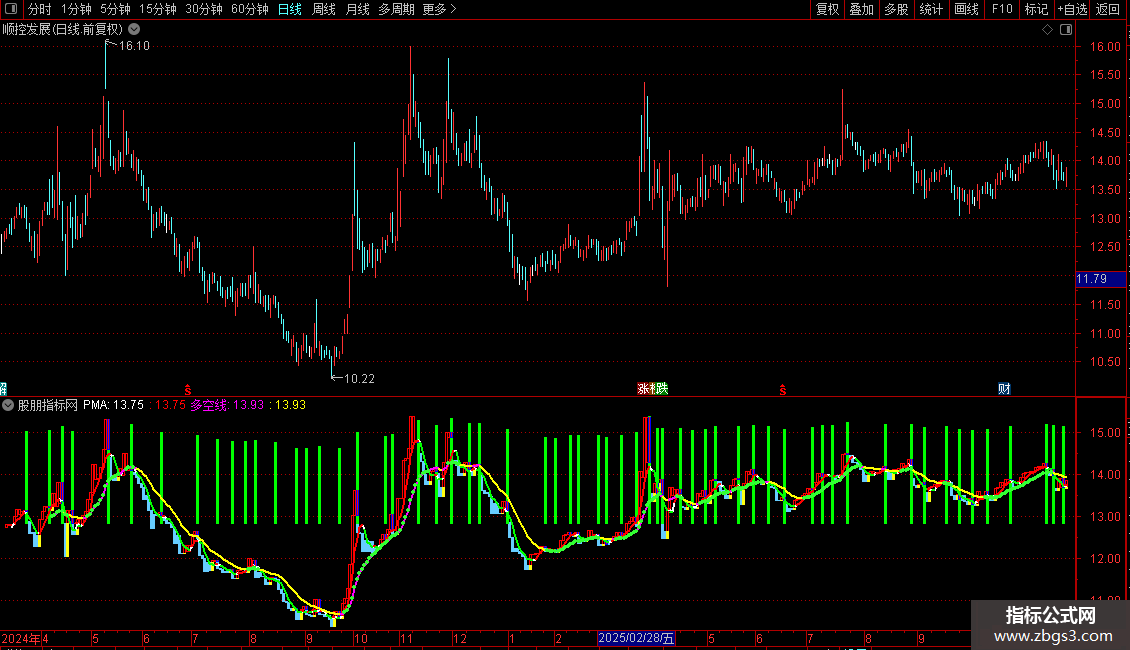 多空线:(20*X+19*REF(X,1)+18*REF(X,2)+17*REF(X,3)+16*REF(X,4)+15*REF(X,5)+14*REF(X,6)