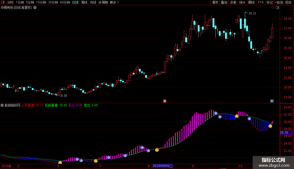 反转通道:MA(上升通道,15),COLORGREEN;
