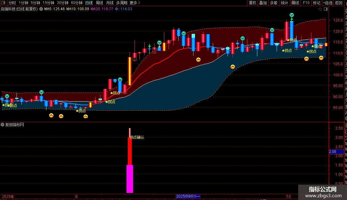 指标旨在捕捉个股首次强势涨停后的“拐点”机会。它通过识别当日大幅放量、股价快速拉升、收盘价明显高于开盘价,并且短期趋势已转强的股票,来判断是否出现主力资金启动的信号。同时结合前一日成交金额与当前的对比,排除连续爆量的情况,聚焦于首板或初期启动阶段的标的。当所有条件吻合时,系统会以彩色柱状线和文字提示“拐点确认”,作为潜在买入信号。