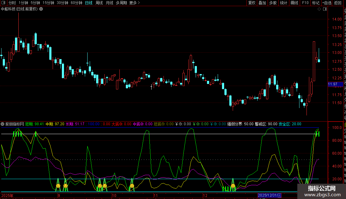 STICKLINE(短期>90 AND 中期>70,86,94,1,0),COLOR00FF00;