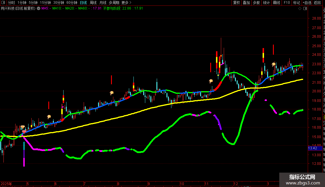 不参与阶段:IF(ZBGS350<=ZBGS358 AND 牛熊分道>REF(牛熊分道,5),ZBGS350,ZBGS350),COLORGREEN,LINETHICK4;