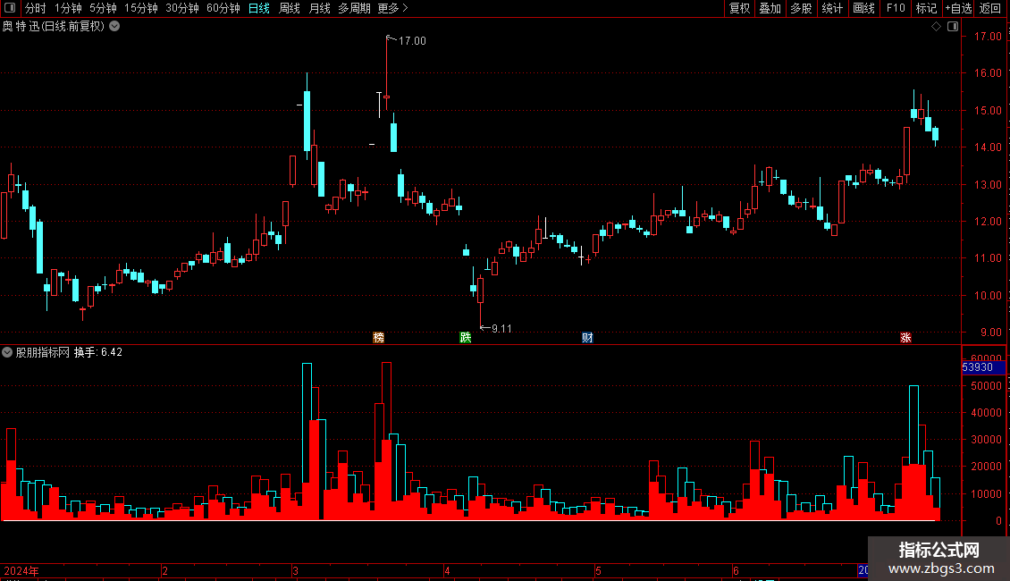 当满足条件收盘价=OANDC>1日前的收盘价时,在0和成交量(手)位置之间画柱状线,宽度为4.5,1不为0则画空心柱.,画红色