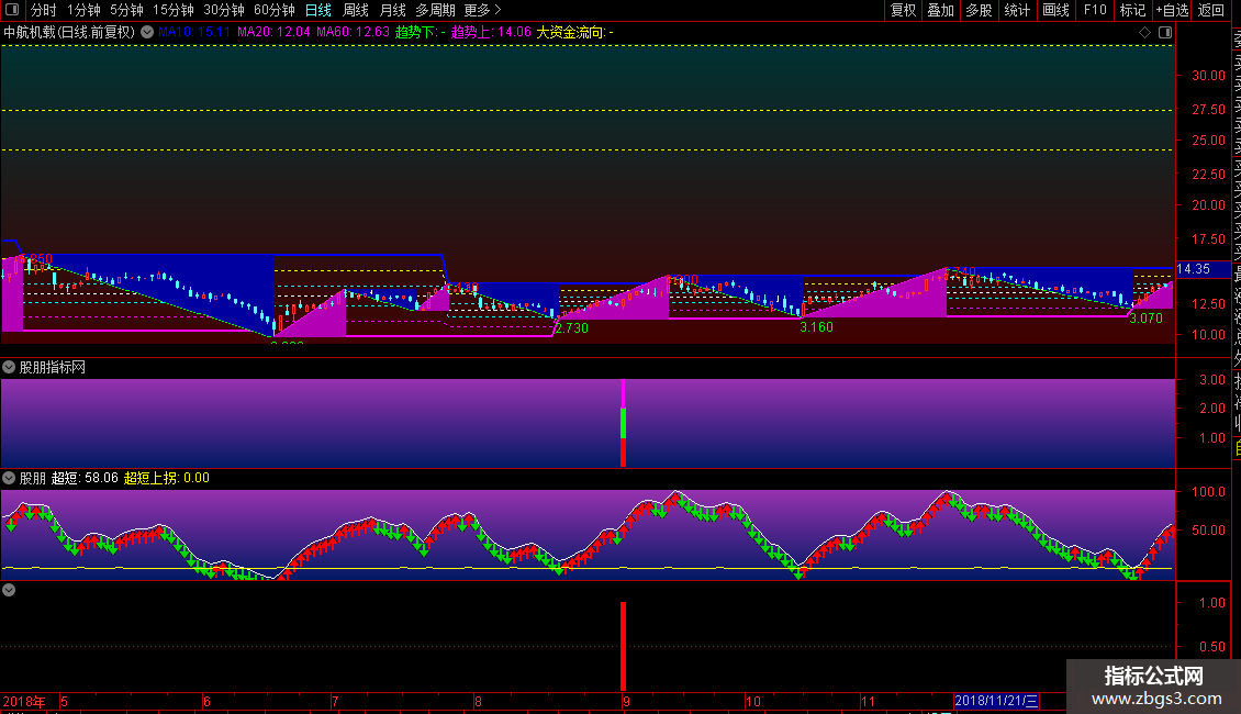 当您观察到底部有上涨信号时,可以选择立即抄底或者等待主图中的紫色三角形出现后进行买入操作。