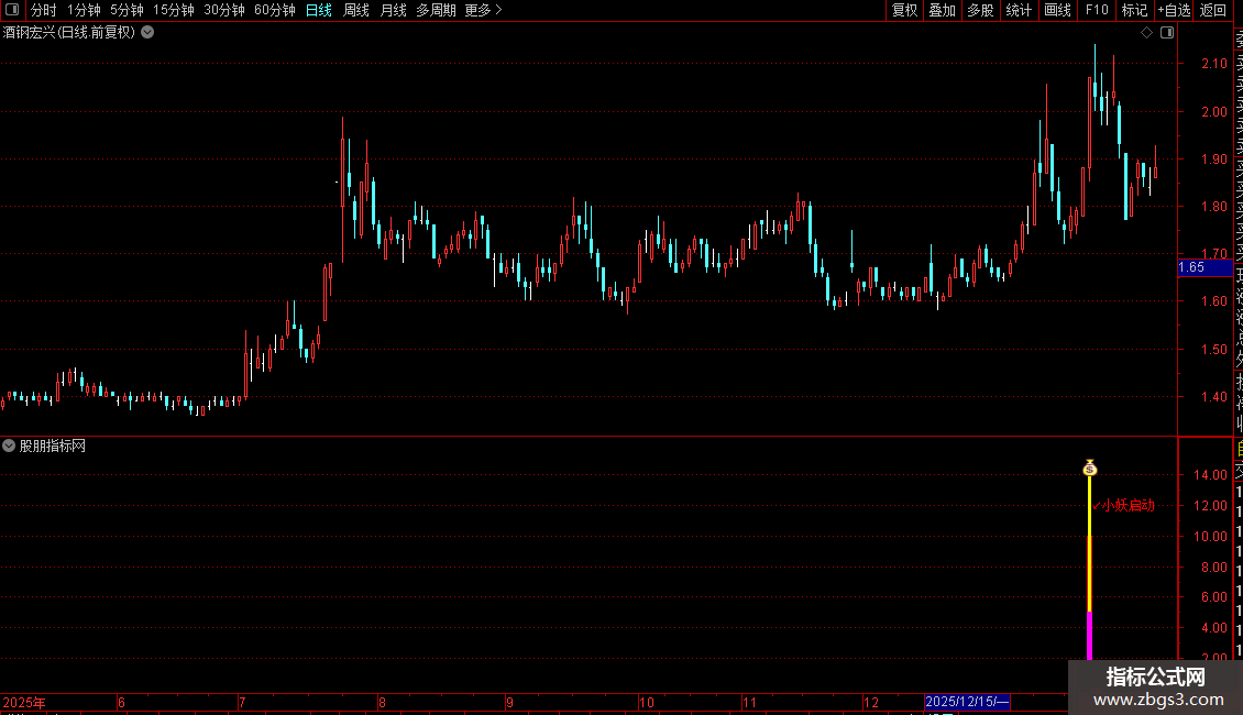指标主要用于识别股价在经历短期调整或低位盘整后,出现放量强势反弹的启动信号。其核心逻辑结合了价格偏离均线的程度、成交量突增、短期动能增强以及特定K线形态(如阳线、涨幅达标等)进行综合判断。当多个条件同时满足时,系统会标记“小妖启动”信号,提示潜在的短线买入机会。