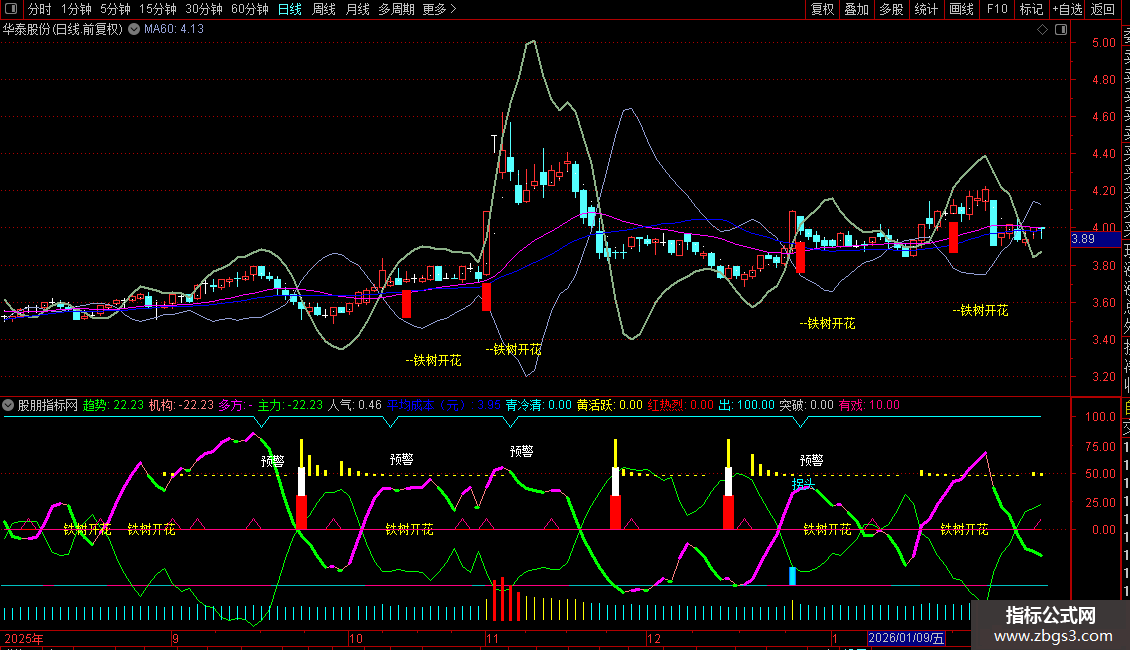 2.主副图趋势线出现开花形态,且出现铁树开花信号共振是机会。