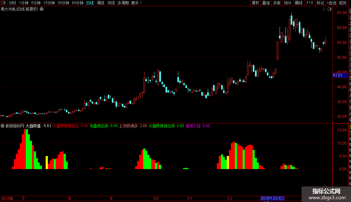 大趋势持续出货:BARSLASTCOUNT(大趋势值<0 AND FGL<0),COLORGREEN,NODRAW;