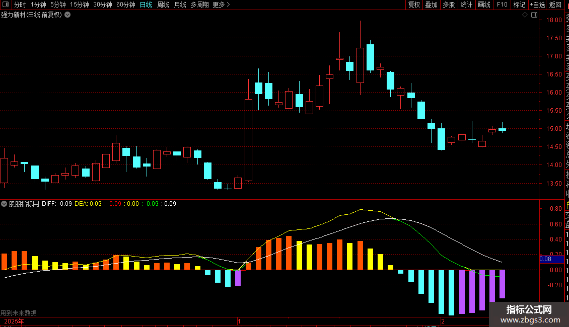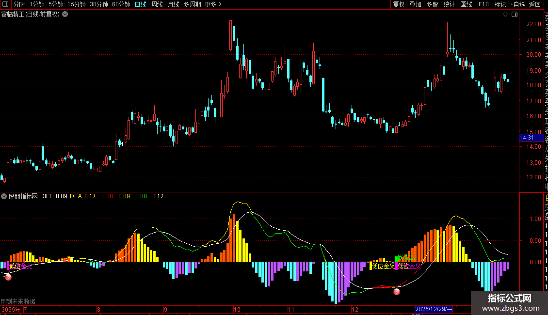 4、在下跌行情中,绿柱的出现表明个股处于下跌趋势,此时不宜介入。当绿柱达到最大时,往往预示底部临近;而紫色柱状图的出现,则说明个股反弹行情开始,这正是利用该指标进行操作的介入时机。掌握这些股票技术指标分析要点,能帮助投资者更有效地把握买卖点。