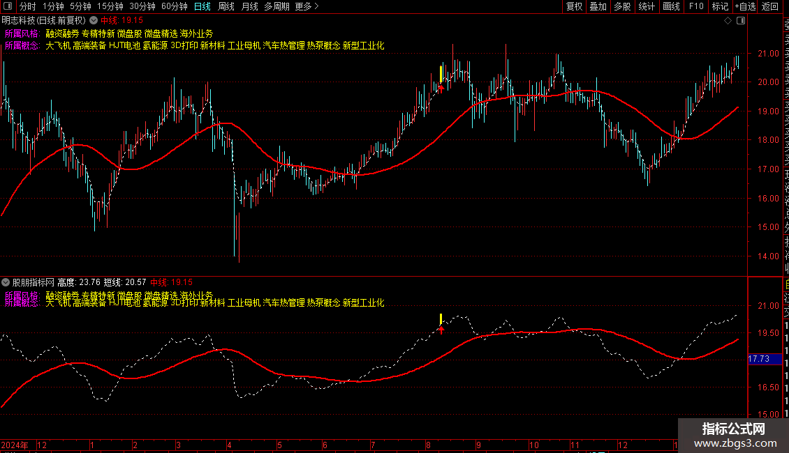御龙指路:=BARSLASTCOUNT(高度>0 AND 高度>=50)=1 AND MACD.MACD>0 AND ZC AND 去昨天;
