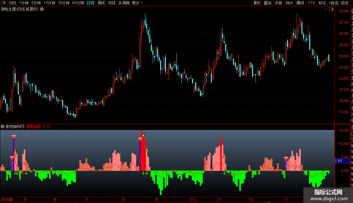 DRAWICON((REF(强度指数,1)-强度指数)>=1.5 AND 强度指数>0,0,2);