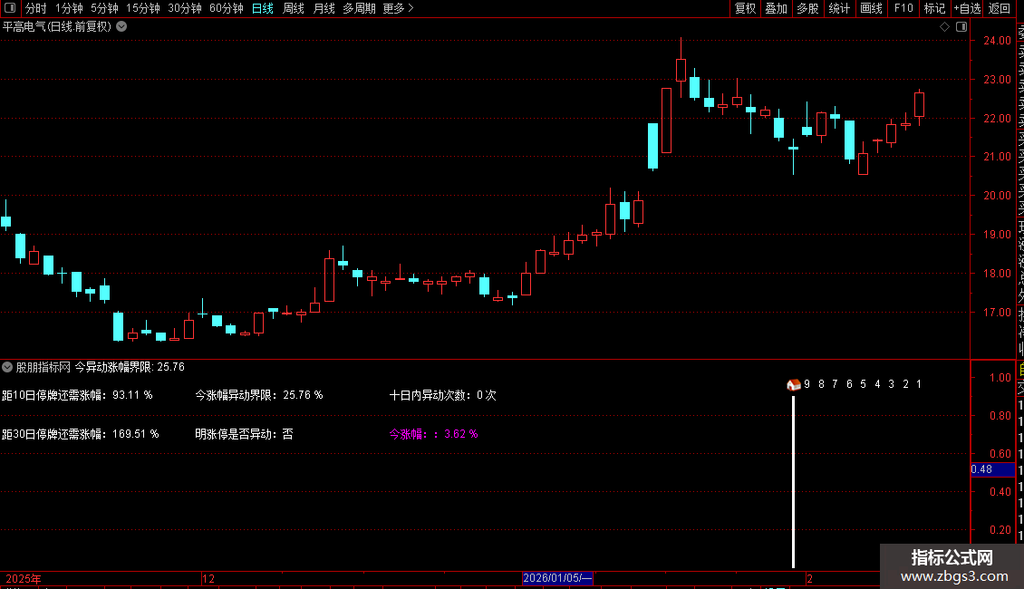 指标主要用于监控个股短期价格异动,通过对比个股与所属板块指数的相对强弱,识别显著跑赢大盘的异常上涨行为。系统会动态计算当前及未来涨停是否构成“异动”,并结合历史异动频次、所需涨幅阈值等维度进行综合评估。同时,在图表上标注近期成交量重复出现的时点,并在固定位置显示关键数据,如距停牌所需涨幅、当日涨跌幅、异动界限和十日内异动次数等,便于快速判断个股活跃度与监管风险。